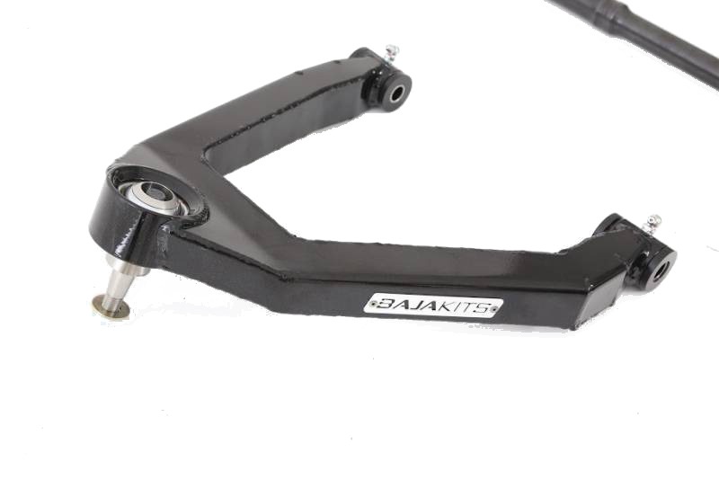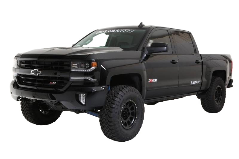 Baja Kits Prerunner Suspension Kit excels in the dirt while retaining excellent on-road handling and comfort. The kit is a direct bolt-on to your 4WD Chevy Silverado. Engineered to be a complete mid travel suspension system, it uses Trophy Truck grade uniballs and hardware on both the Upper and Lower arms. Heavy duty fabricated steel arms handle the abuse while custom tuned King coilover shocks with remote reservoirs and compression adjusters for precise tuning handle suspension damping. (Rear kits available too).
