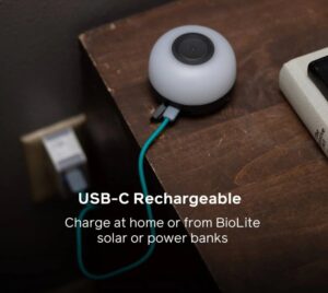 BioLite AlpenGlow Mini Lantern delivers 150 lumens of warm white or color light. USB-rechargeable with ChromaReal LEDs & bungee strap for easy setup.