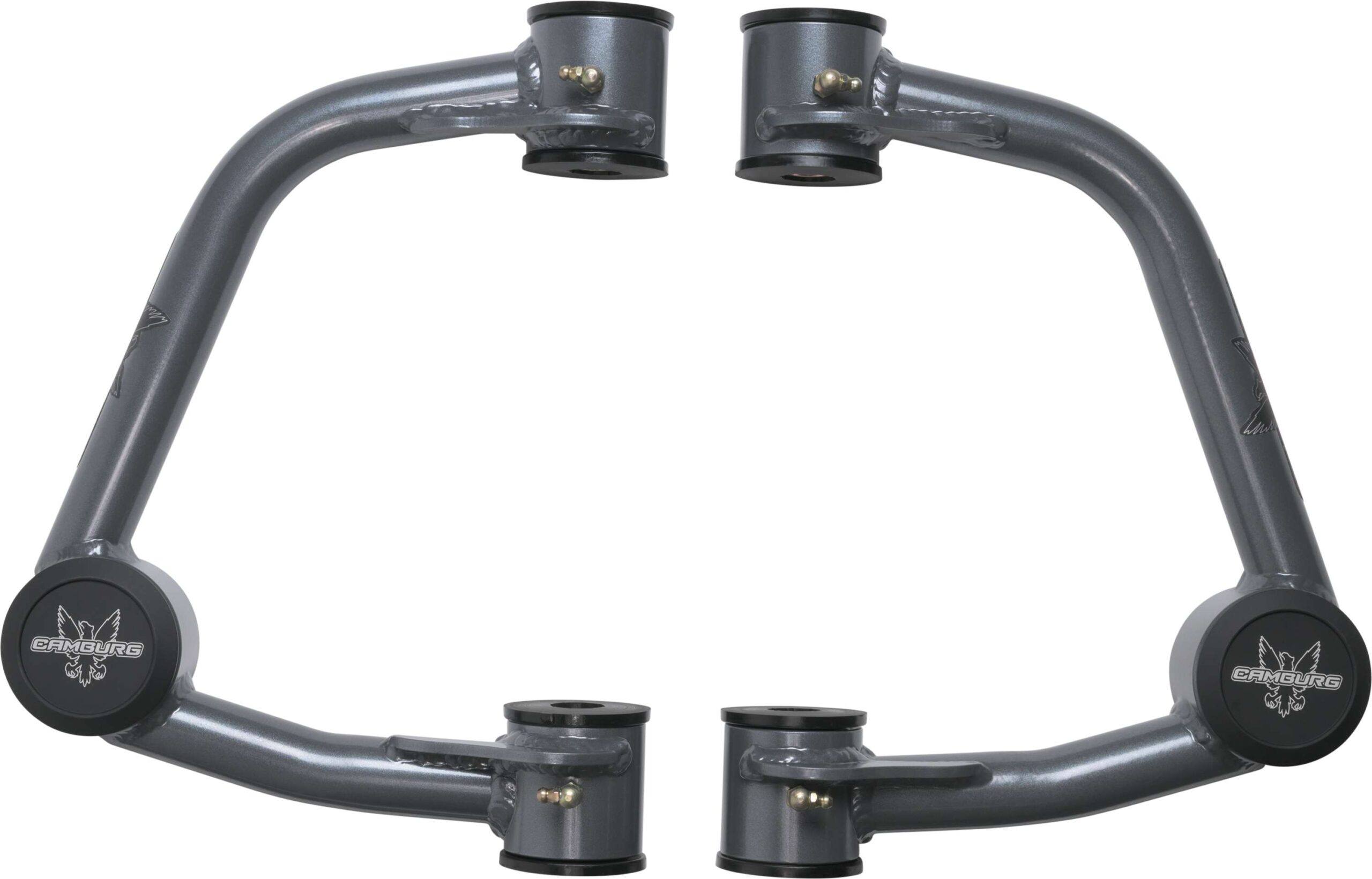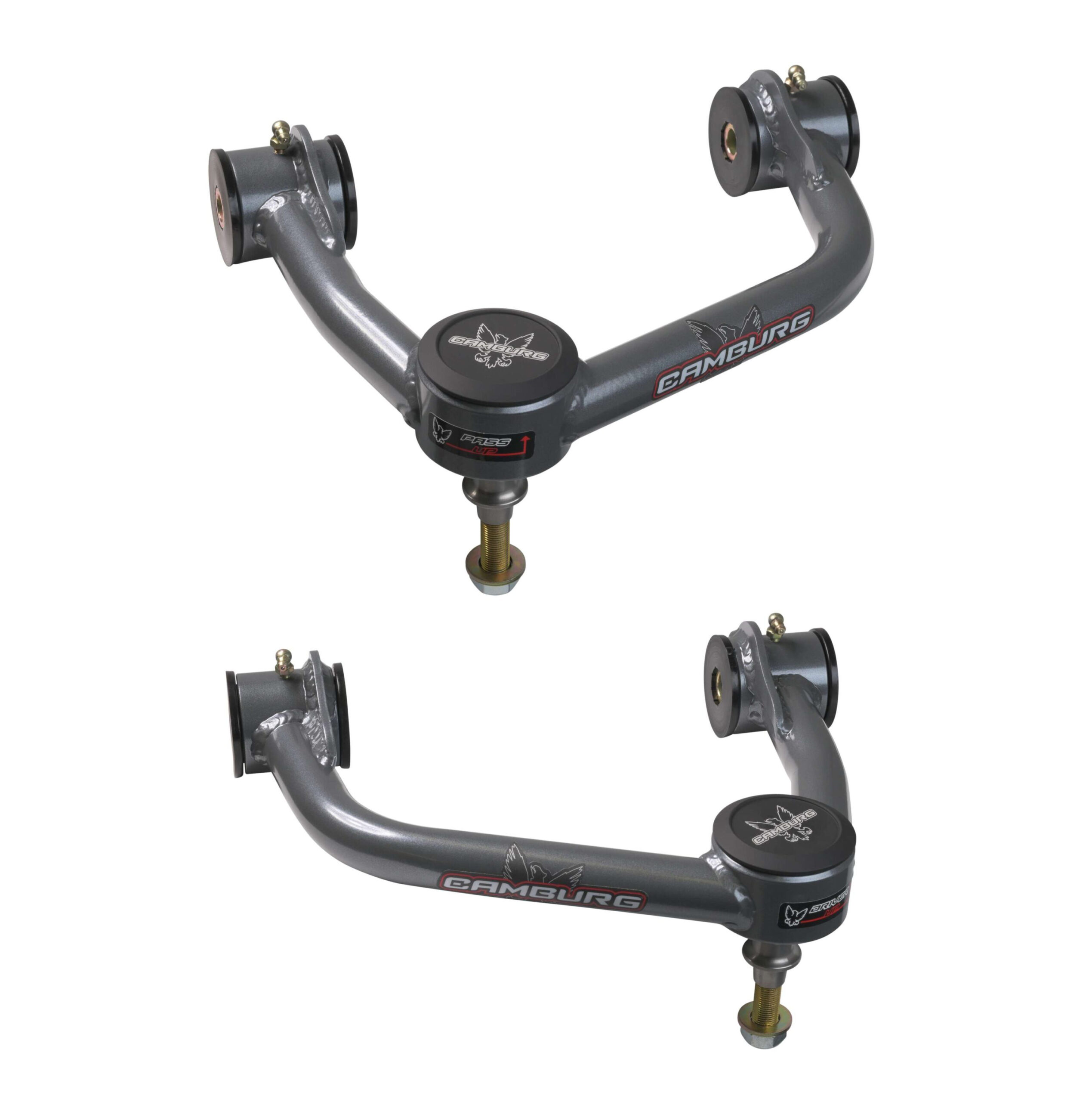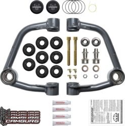 Our Camburg upper arms are designed to address the limitations of stock upper arms when lifting your truck. By replacing the stock ball-joint with a larger 1.25 uni-ball bearing, we improve wheel travel and durability under extreme conditions. We also incorporate a billet aluminum cover to protect the uniball from dirt and contaminants. Our arms are designed using CAD/CAM engineering software and manufactured in-house with precision welding and machining. They come with polyurethane frame pivot bushings, FK 1.25″ PTFE-lined uniballs, and all necessary hardware for installation. These arms are compatible with lifts of 1-3″ and correct camber and caster