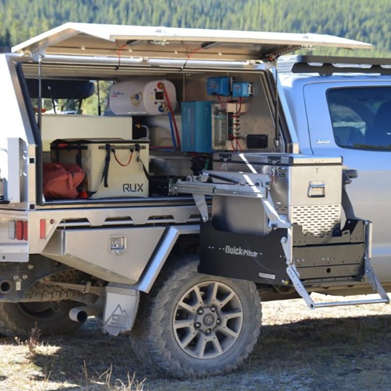 he Quick Pitch Drop Down Kitchen Combo is the perfect solution for any overlander and was designed for overlanding vehicles with flat trays. This product is a combination of a Drop-Down Fridge Slide and a mini kitchen. Dropping your kitchen and fridge all together to a workable height, giving you ample storage space.