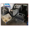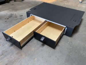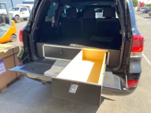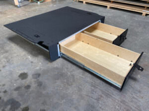 This Land Cruiser Specific Module features a bullet lined top plate for increased durability as well as a location to mount additional items such as anchors for fridge and cooler straps etc. The top plate is wider than the module and has wings that extend past the sides of the drawer module to follow the contours of the vehicle interior. On either side of the module there are two access doors in the top of the plate that create a lockable space just behind the wheel wells. This creates a flat surface that runs from wall to wall, seat back to back door.